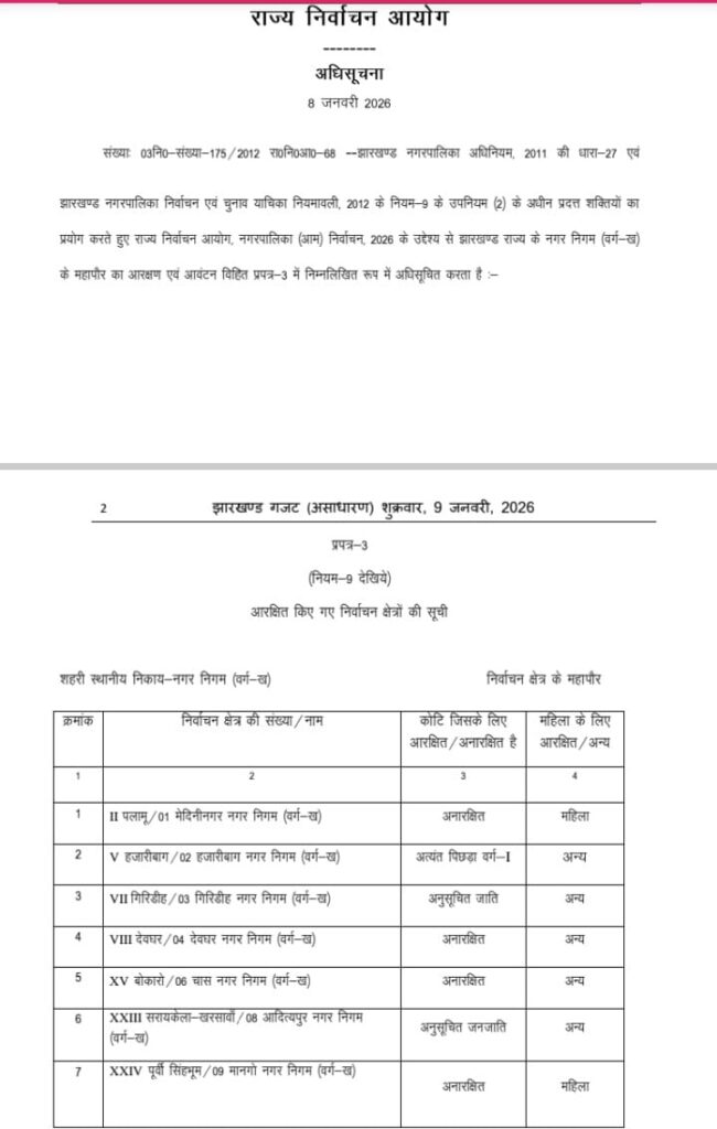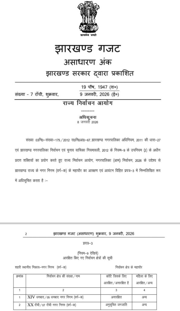 RANCHI : झारखंड में लंबे समय से रुके पड़े नगर निकाय चुनावों को लेकर अब तस्वीर पूरी तरह साफ हो चुकी है. राज्य निर्वाचन आयोग ने मेयर और अध्यक्ष पदों के लिए आरक्षण सूची जारी कर दी है, जिसके साथ ही शहरी सरकार के चुनाव की तैयारी अंतिम चरण में गई है. इस अधिसूचना के जारी होते ही राजनीतिक दलों और संभावित उम्मीदवारों की गतिविधियां तेज हो गई हैं.