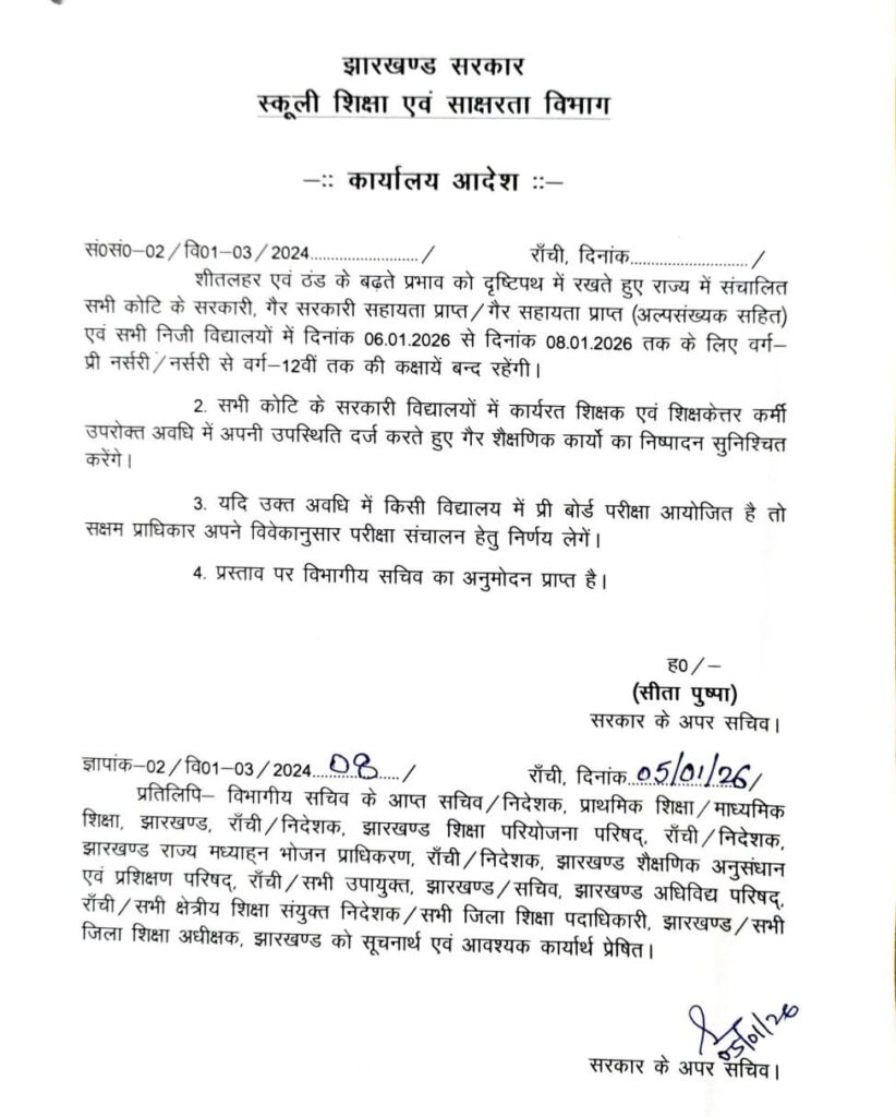 रांची |झारखंड में बढ़ती ठंड और शीतलहर के प्रभाव को देखते हुए राज्य सरकार ने बड़ा फैसला लिया है। स्कूली शिक्षा एवं साक्षरता विभाग के आदेश के अनुसार राज्य के सभी सरकारी, गैर-सरकारी, सहायता प्राप्त, गैर-सहायता प्राप्त, अल्पसंख्यक एवं निजी विद्यालयों में 6 जनवरी से 8 जनवरी 2026 तक कक्षाएं स्थगित रहेंगी।