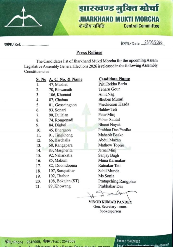 झामुमो ने असम में अपनी चुनावी तैयारी तेज कर दी है. पार्टी ने 21 सीटों पर उम्मीदवारों की लिस्ट जारी कर दी है. इन सीटों पर पार्टी खासतौर पर आदिवासी और टी-ट्राइब वोट बैंक को साधने की कोशिश कर रही है. इसी कड़ी में JMM ने असम के मुख्य निर्वाचन अधिकारी के पास अपने पारंपरिक चुनाव चिन्ह ‘तीर-कमान’ के आवंटन के लिए आवेदन किया था, जिसे मंजूरी मिल चुकी है. इससे पार्टी को झारखंड के बाहर भी अपनी पहचान के साथ चुनाव लड़ने का मौका मिलेगा.