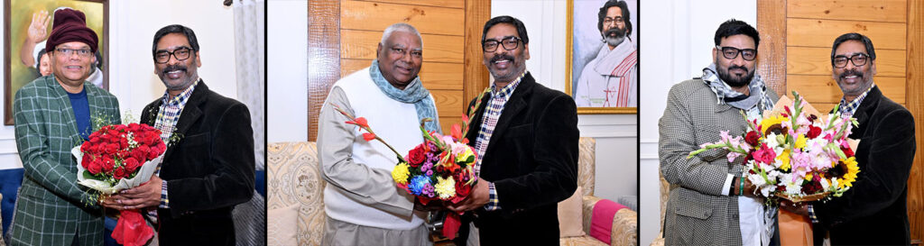 RANCHI : कांके रोड स्थित मुख्यमंत्री आवासीय कार्यालय में आज मंत्री चमरा लिंडा, मंत्री हाफिजूल हसन तथा सत्तारूढ़ दल के मुख्य सचेतक मथुरा प्रसाद महतो ने मुख्यमंत्री हेमंत सोरेन से मुलाकात की.