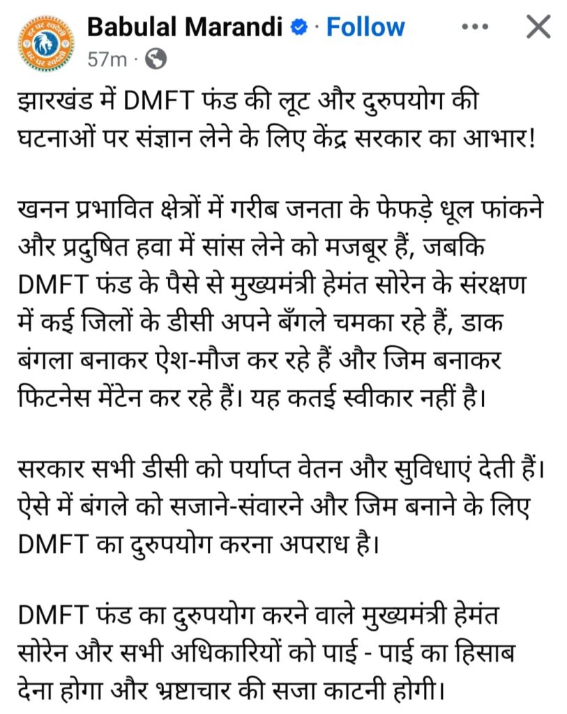 उन्होंने अपने सोशल मीडिया हैंडल पर लिखे एक पोस्ट के माध्यम से राज्य के मुख्यमंत्री और अधिकारियों से DMFT फंड के पाई-पाई का हिसाब मंगा है. उन्होंने इस मामले में संज्ञान लेने के लिए केंद्र सरकार को धन्यवाद देते हुए लिखा है कि खनन प्रभावित क्षेत्रों में गरीब जनता प्रदूषित हवा में सांस लेने को विवश है जबकि राज्य के अधिकारी, मुख्यमंत्री के संरक्षण में DMFT फंड का दुरूपयोग करके अपने बंगले चमका रहे हैं. डाक बंगला बना कर मौज कर रहे हैं. एक ओर जहां खनन प्रभावित क्षेत्र में प्रदूषित हवा के कारण गरीब जनता फेफड़ों की बीमारी झेलने को मजबूर है. वहीं राज्य के अधिकारी DMFT के फंड से जिम बनाकर फिटनेस मेंटेन कर रहे हैं. उन्होंने आरोप लगाते हुए कहा कि सरकार सभी डीसी को वेतन सहित अन्य सुविधाएं देती है. ऐसे में बंगले को सजाने-संवारने और जिम बनाने के लिए DMFT फंड का दुरूपयोग करना अपराध है.
