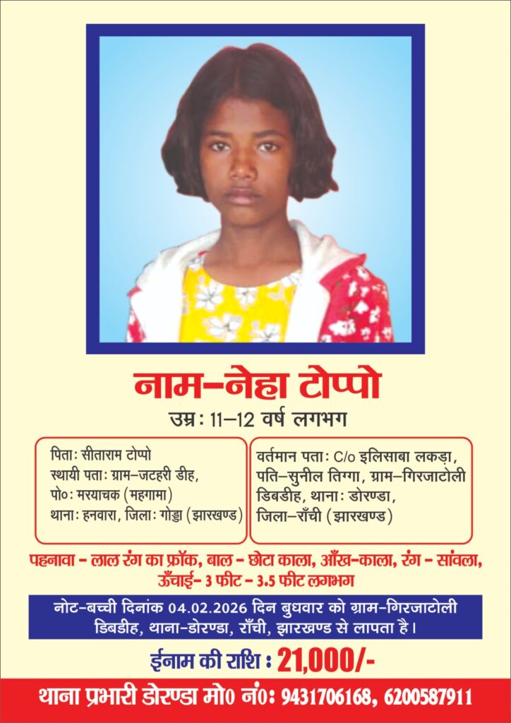 नेहा टोप्पो की जानकारी देने वाले को पुलिस देगी 21 हजार रुपए का ईनाम - Loktantra19