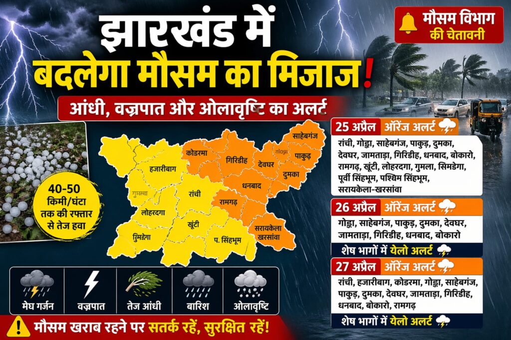 25 अप्रैल को रांची के साथ-साथ गोड्डा, साहेबगंज, पाकुड़, दुमका, देवघर, जामताड़ा, गिरिडीह, धनबाद, बोकारो, रामगढ़, खूंटी, लोहरदगा, गुमला, सिमडेगा, पूर्वी सिंहभूम, पश्चिम सिंहभूम और सरायकेला-खरसांवा जिलों में मौसम अधिक सक्रिय रहने की संभावना है। इन क्षेत्रों में गर्जन, वज्रपात, 40 से 50 किलोमीटर प्रति घंटे की रफ्तार से तेज आंधी और ओलावृष्टि की आशंका को देखते हुए मौसम विभाग ने ओरेंज अलर्ट जारी किया है. 26 अप्रैल को गोड्डा, साहेबगंज, पाकुड़, दुमका, देवघर, जामताड़ा, गिरिडीह, धनबाद और बोकारो जिलों में ओलावृष्टि और वज्रपात की संभावना जताई गई है. इन जिलों के लिए ओरेंज अलर्ट जारी किया गया है। वहीं राज्य के अन्य हिस्सों में भी कहीं-कहीं मेघ गर्जन, वज्रपात और तेज हवा चलने की संभावना है.